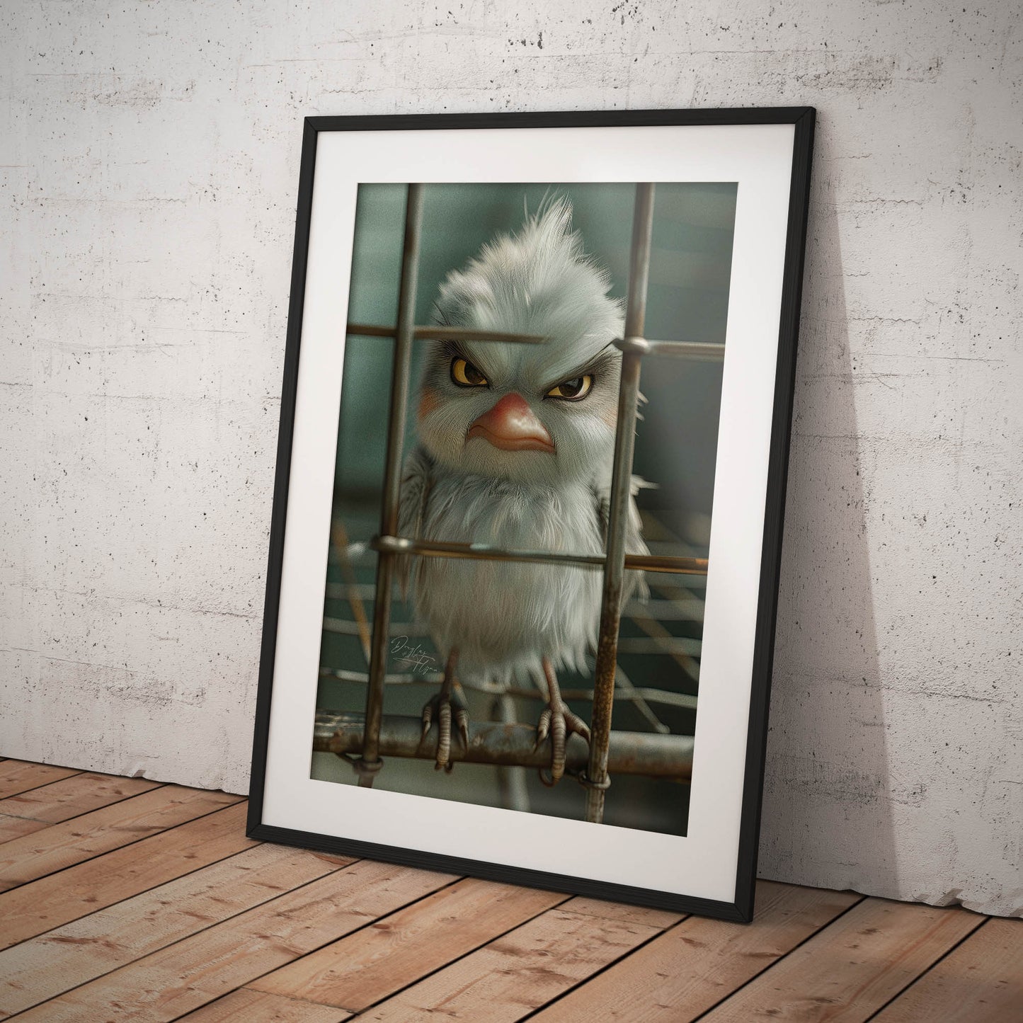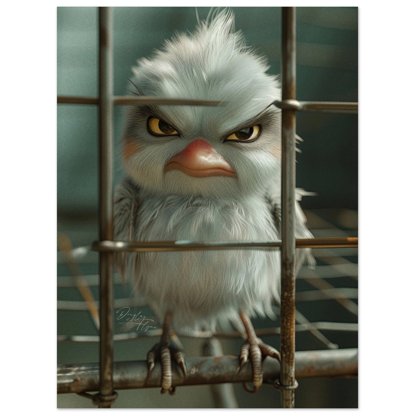 En jättesur burfågel, tecknad i fantasifull och engagerande stil. Djuret är avbildat med livliga färger och uttrycksfulla detaljer, vilket skapar en känsla av värme och karaktär. Den digitala illustrationen har tagits fram med hjälp av den senaste AI-tekniken, vilket bidrar till en unik och modern känsla i motivet.