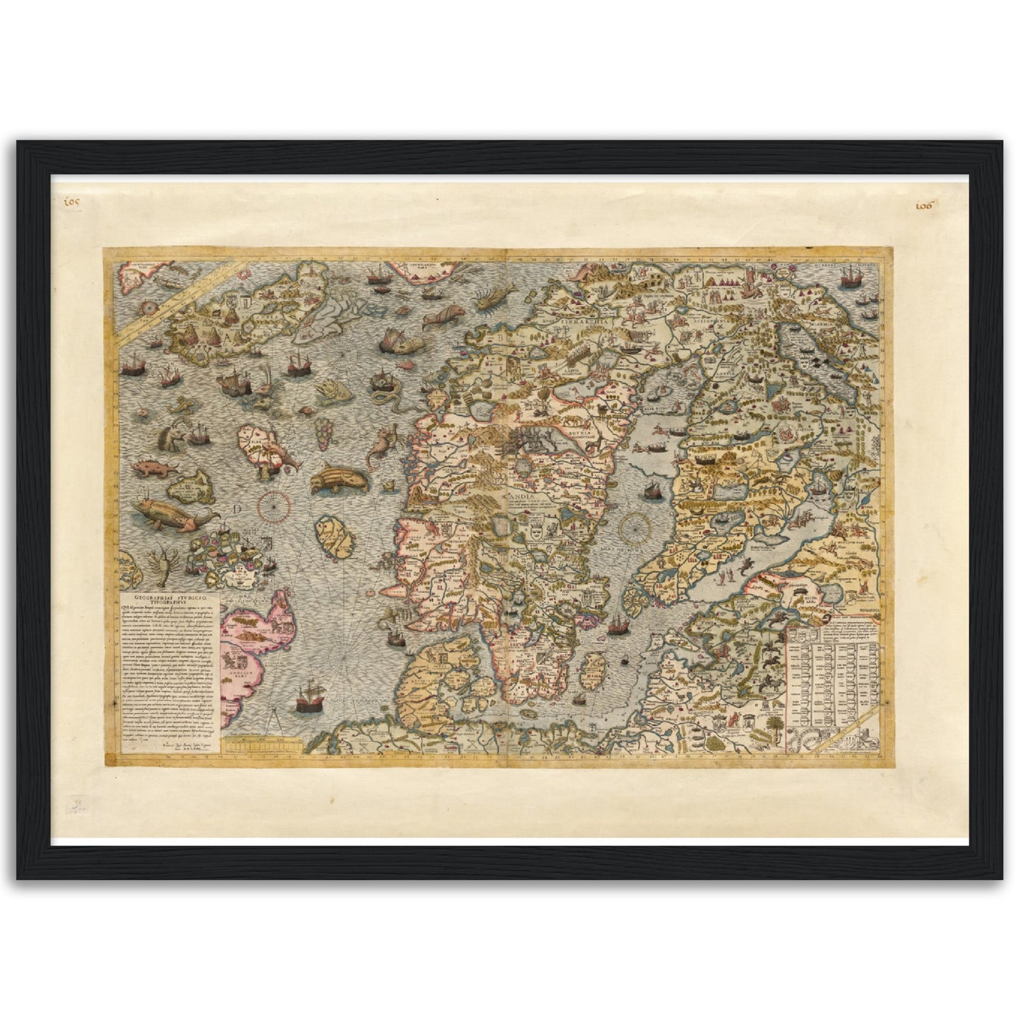 Poster med Carta Marina Norden 1539. Den här fantastiska kartan anses vara den äldsta som visar Norden på ett någorlunda rättvisande sätt. Den första versionen trycktes i Venedig redan 1539 och togs fram av Sveriges siste katolska ärkebiskop Olaus Magnus. Senare omarbetades den och trycktes om i Rom 1572.