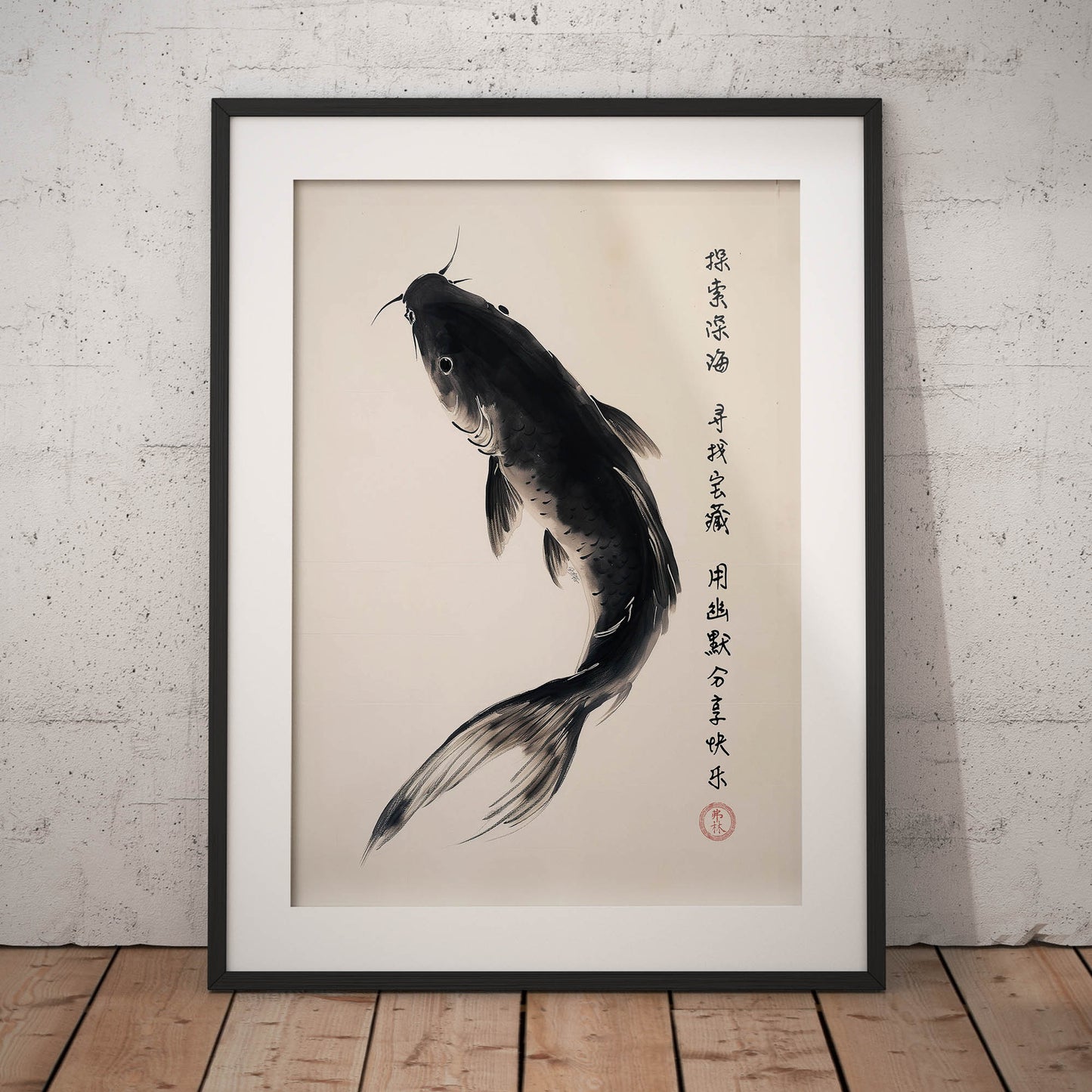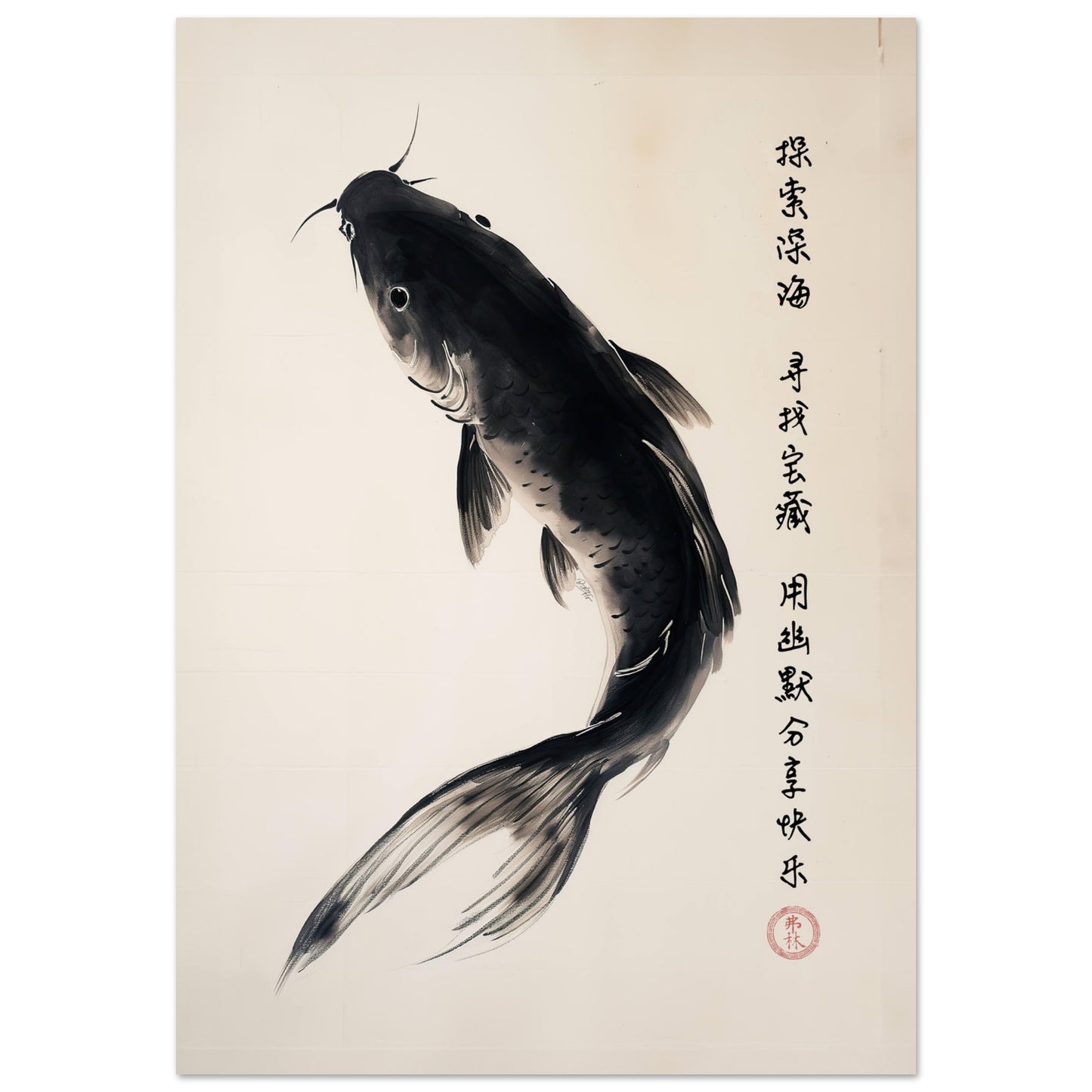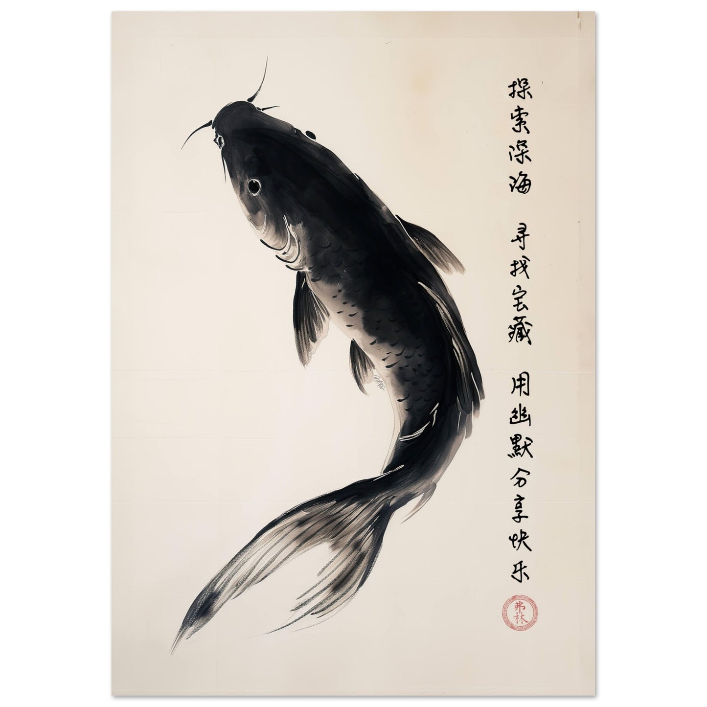 Poster med karp och kinesiskt visdomsord »Utforska djupet, hitta skatter och dela glädje med humor.« i form av en konstnärliga hyllning till den traditionella kinesiska målningstekniken, där bläck används på papper för att framkalla en känsla av stillsam skönhet och djup. Motivet är framställt med enkla, men kraftfulla penseldrag som skildrar naturens elegans. Motivet fångar naturens livfullhet och känslan av rörelse, samtidigt som det behåller en känsla av minimalism och renhet i designen. Konstverket har skapats delvis med hjälp av modern digital AI-teknik, vilket ger en unik touch till det traditionella uttrycket.
